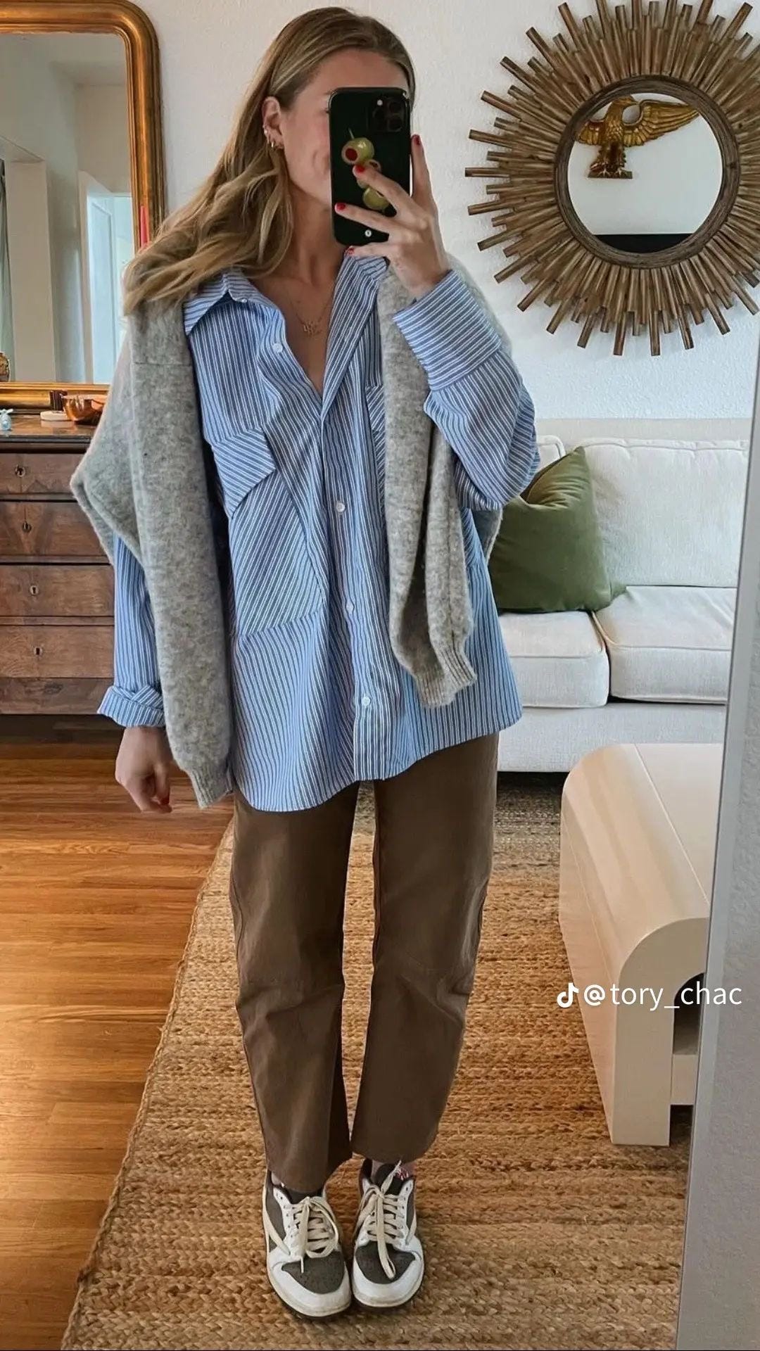 I like that oversized striped blue shirt with the brown trousers and simple trainers. The whole looks is made quite fun with the cashmere thrown over the shoulders. Another way to have the warmth of a sweater without compromising on not showing the shirt would be to wear a loose sweater gilet.