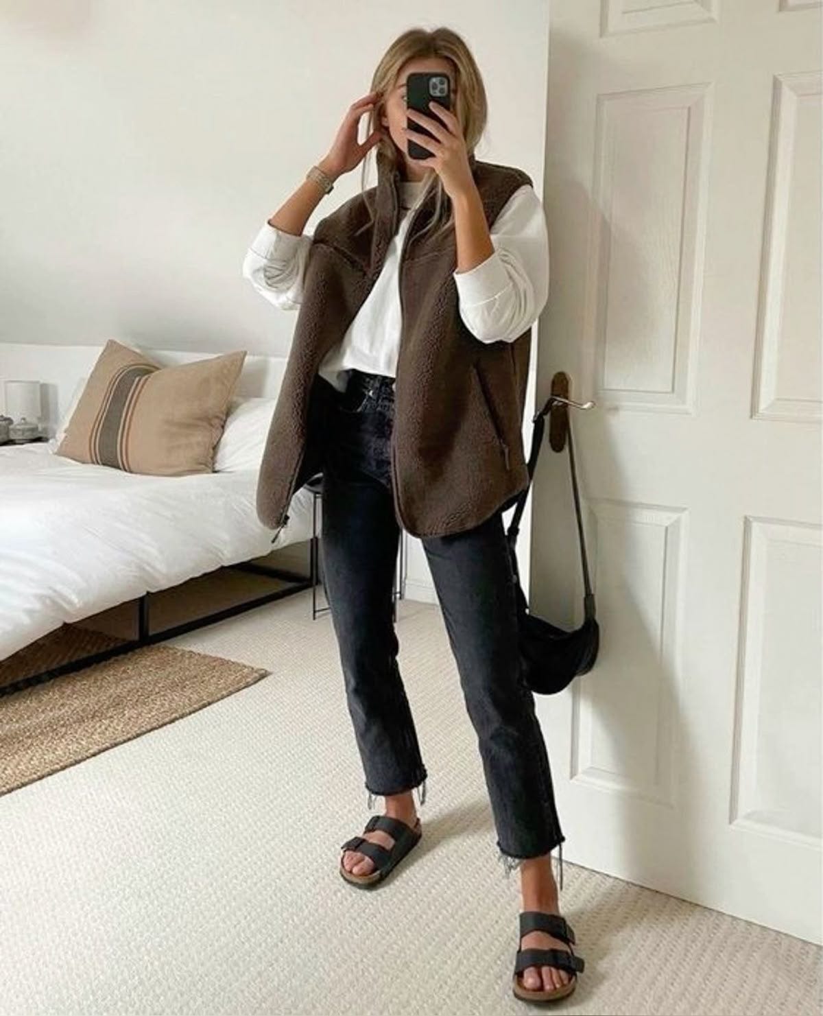 Love this look, as someone who gets very cold in the winter, I am a big fan of the sherpa gilet over a sweater, or a sweatshirt at this time of year. Those cropped jeans also look great, I would personally choose clogs over sandals but this is a very nice, relaxe look. I like the balance of the oversized top with a slimmer lag shape, I think it can be a little more elegant in some cases.